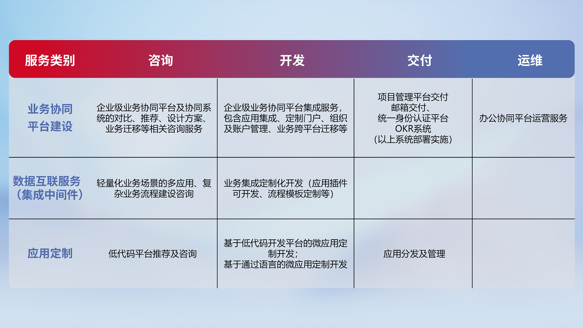 针对钉钉、、企微、、IDaas等平台级产品提供产品的规划、、、、方案、、、交付、、、定制化开发等服务,,,,实现如统一协同办公、、智能客户服务、、混合会议管理、、、智能数据查询、、等业务场景,,,,实现数字化转型。。。