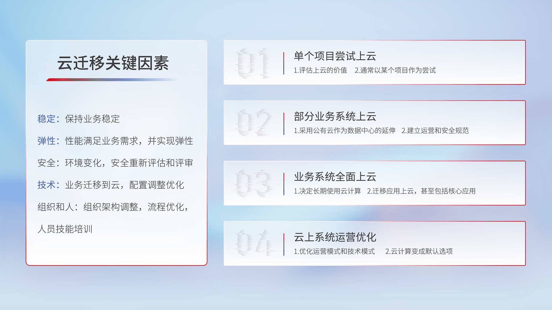 结合实际业务,,,,从规划设计、、、、云平台选型、、、云原生改造、、数据迁移、、、集成交付,,,迁移全过程为客户识别最佳上云路径,,,,做好风险识别管理,,,,设计网络架构、、身份权限、、、、安全审计合规、、、、操作审计、、日志审计、、、、监控告警策略、、、多站点容灾设计等,,,,对云上基础设施进行整体规划,,,,提升IT治理水平,,,,以满足弹性、、、、高可用、、、、高性能的需求。。。。